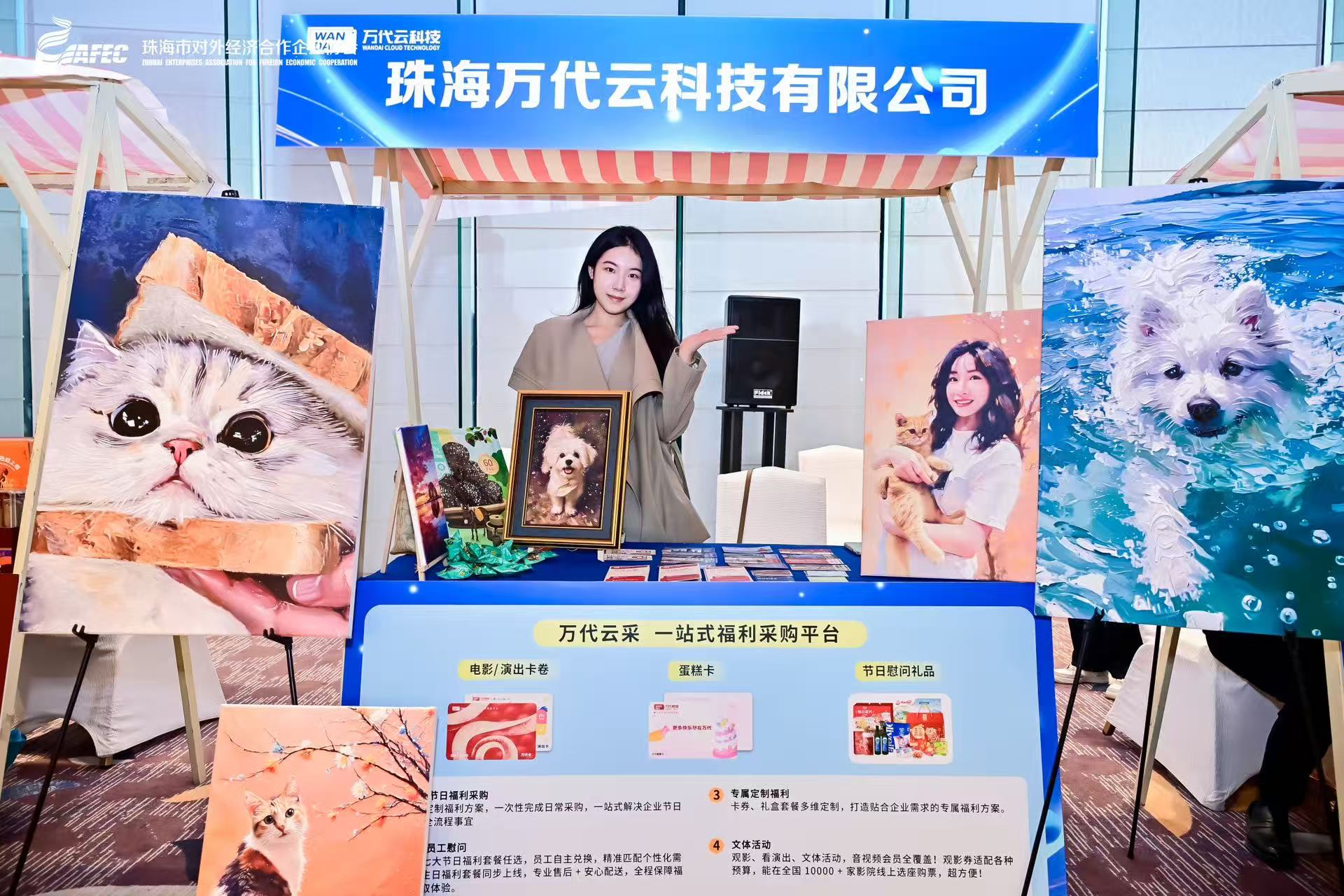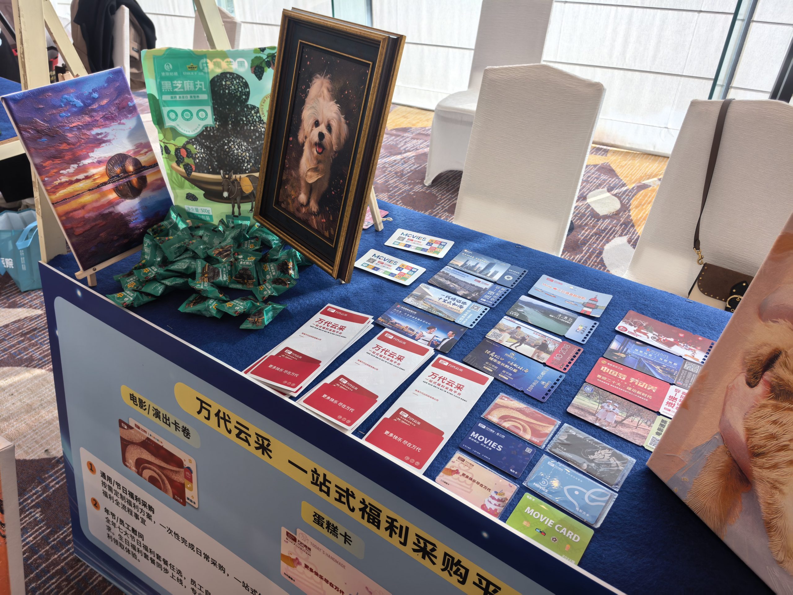 活动现场,万代云采集中展示品牌宣传册、福利产品实物及数字化采购系统相关资料,涵盖文旅票务、节日礼品、蛋糕卡券等多品类福利产品,以及全流程数字化服务、个性化定制服务等核心内容,让来访嘉宾能够直观看到平台的供应深度与选择丰富度。