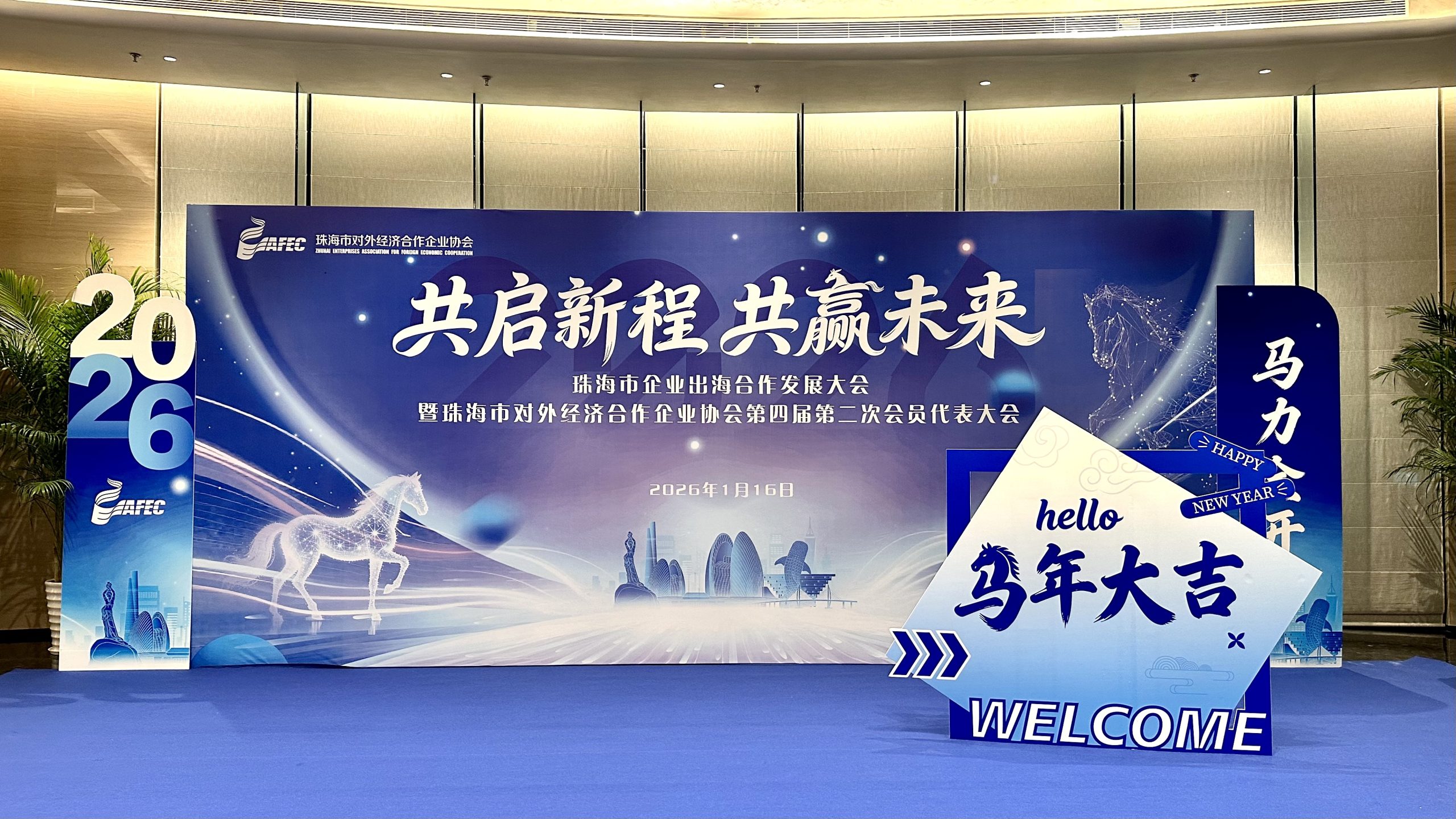 2026 年1月16日,“共启新程,共赢未来”珠海市对外经济合作企业协会第四届第二次会员代表大会,在珠海度假村酒店顺利举办。万代云采作为理事单位受邀参展,以实体展位形式展示核心业务,与到场政企代表开展务实交流。
